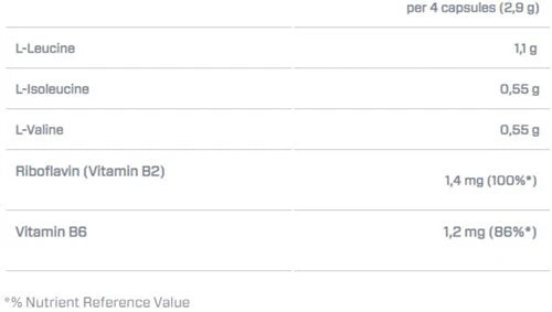 - BCAA-innehåll: 2,2 g per portion (4 kapslar)