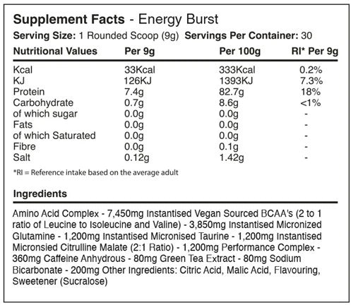 Warrior Amino Blast är en komplett formula som kombinerar veganska BCAA med glutamin, taurin och citrullinmalat. Produkten är dessutom förstärkt med koffein, grönt te-extrakt och natriumbikarbonat för att ge både energi och fokus. Ett perfekt tillskott för dig som vill krossa varje träningspass – eller hålla energinivån uppe under dagen.
