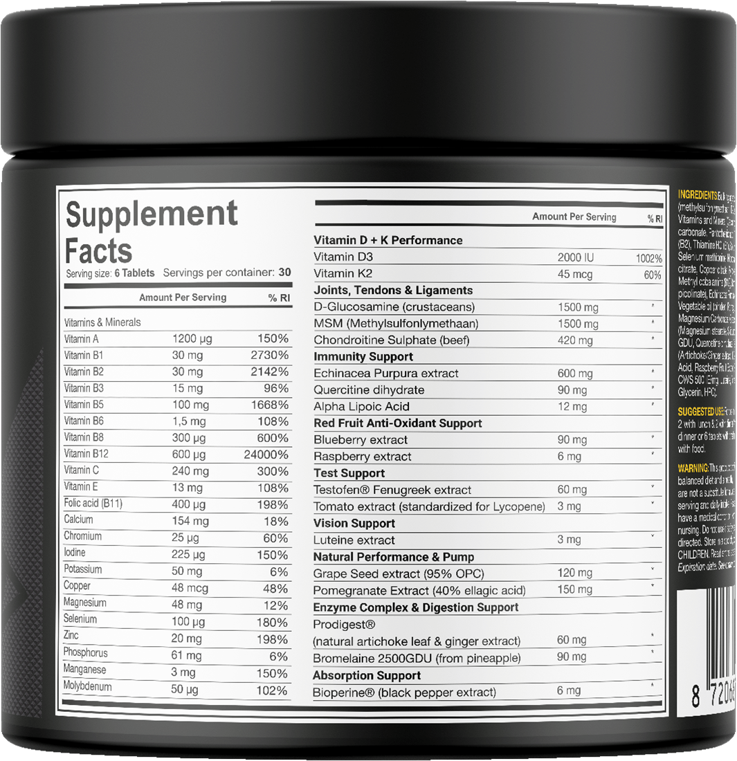 DEDICATED ALPHA TRIAD™ är det ultimata dagliga kosttillskottet för den seriösa atleten. Denna toppklassformula kombinerar 10 produkter i 1, vilket gör den långt mer än ett vanligt multivitamin. ALPHA TRIAD™ är designad för att stötta alla aspekter av prestation och hälsa, från insidan och ut, så att du inte behöver komplettera med flera olika tillskott.