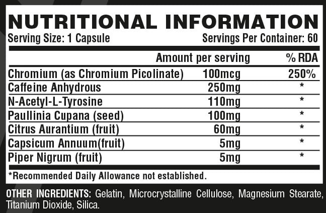 Nutrex Lipo-6 Black UC är en ultrakoncentrerad fettförbrännare designad för snabb och kraftfull effekt med endast en kapsel per dag. Formulan innehåller koffeinanhydrid, N-acetyl-L-tyrosin och växtextrakt som guarana, citrus aurantium och capsicum annuum, tillsammans med krompicolinat för att stödja normal ämnesomsättning.