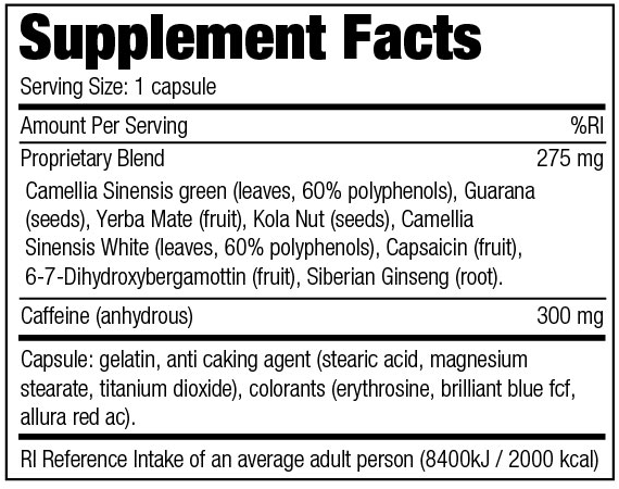 - 300 mg koffein per kapsel – ger snabb energi och ökat fokus