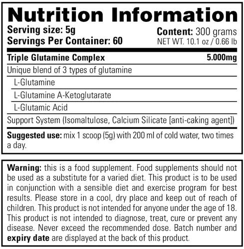 Varje portion innehåller 100% mikroniserat L-glutamin, vilket ger god löslighet, snabb absorption och maximal effekt. Perfekt att använda före eller efter träning, eller när som helst under dagen för att stödja återhämtningen.