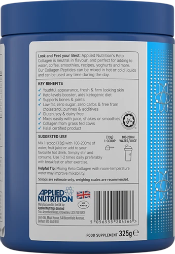 Applied Nutrition Keto Collagen är särskilt framtagen för dig som vill kombinera kollagenstöd för leder och muskler med MCT-fett för energi och fokus. Den neutrala smaken gör det enkelt att integrera i din dagliga kost, samtidigt som formulan är sockerfri, glutenfri, sojafri, mjölkfri och halal-certifierad.