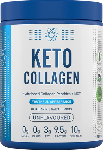 Applied Nutrition Keto Collagen är ett kraftfullt kosttillskott med hydrolyserade kollagenpeptider och MCT C8 & C10. Varje portion ger 10 g kollagen och 9,5 g protein för att stödja muskler, leder och skelett – helt utan socker eller kolhydrater, perfekt för en ketogen livsstil.
