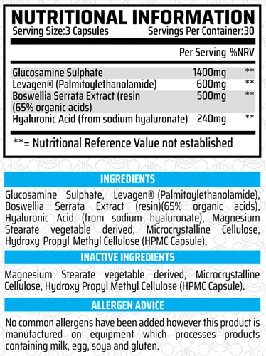 • Ingredienser: Glukosaminsulfat (1400 mg/portion), Levagen® (600 mg/portion), Boswellia Serrata-extrakt, Hyaluronsyra