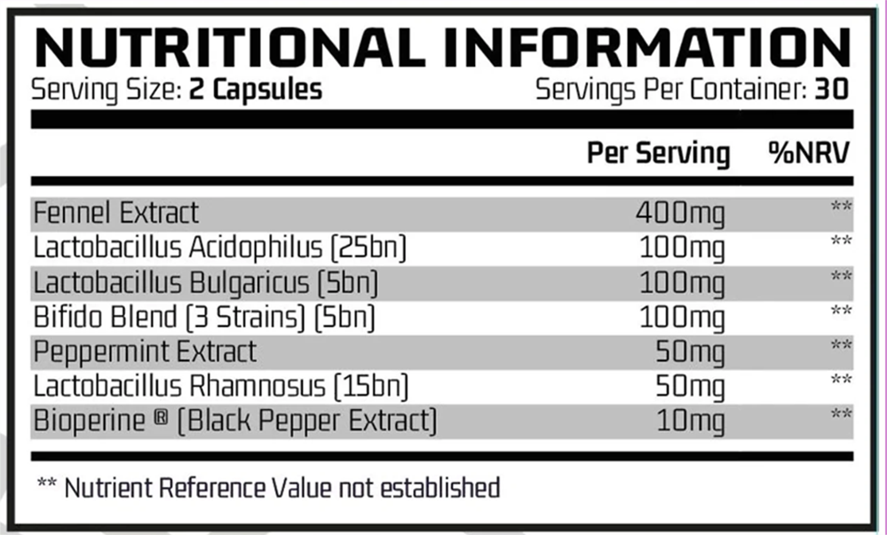 • Växtextrakt: Fänkål 400 mg, pepparmynta (mängd enligt etikett)