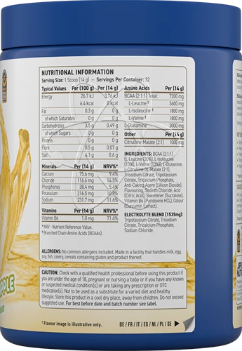 Formulan kombinerar höga doser BCAA och L-glutamin med viktiga mikronäringsämnen. Vitamin B6 bidrar till energiomsättning och ett fungerande immunförsvar. Kalcium stöder normal muskelfunktion, nervsystem och energi, medan kalium hjälper till att bibehålla musklernas styrka och flexibilitet. Tack vare att produkten är helt fri från socker, kalorier och kolhydrater passar den perfekt i en hälsosam och aktiv livsstil.