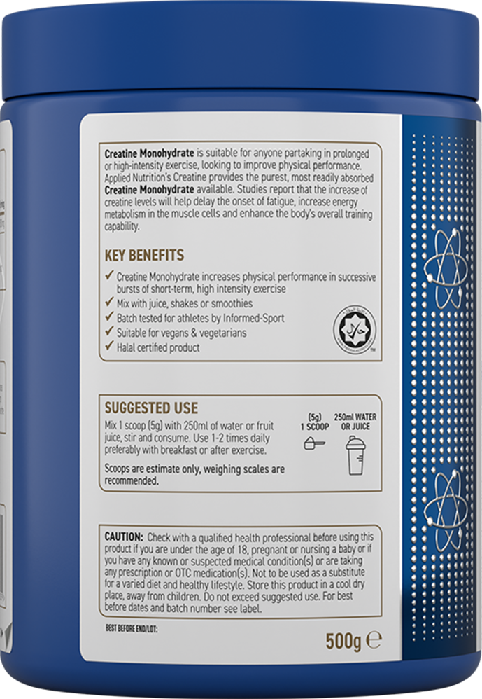 Applied Nutrition Creatine Monohydrate erbjuder 100 % mikroniserat kreatinmonohydrat – den mest studerade och beprövade formen av kreatin. Varje portion innehåller 5 g kreatin som bidrar till ökad fysisk prestationsförmåga vid kortvariga, intensiva träningsinsatser. Produkten är Informed Sport-certifierad och testad för idrottare, vilket garanterar högsta kvalitet och renhet.