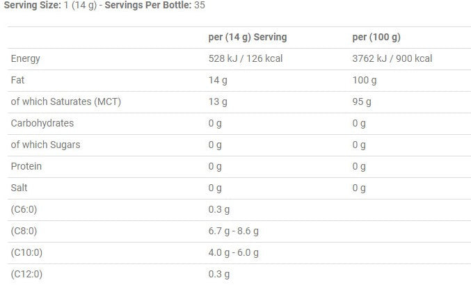 - Innehåll: MCT-olja med C8 (kaprylsyra) och C10 (kaprinsyra)