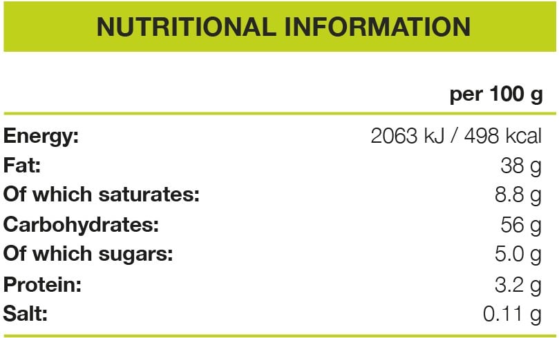 - Innehåll: 13 % hasselnötter, 7 % lågfetts-kakao