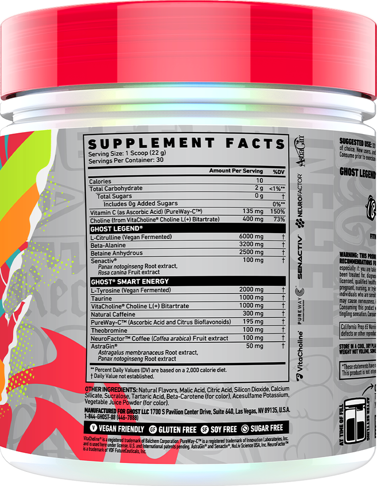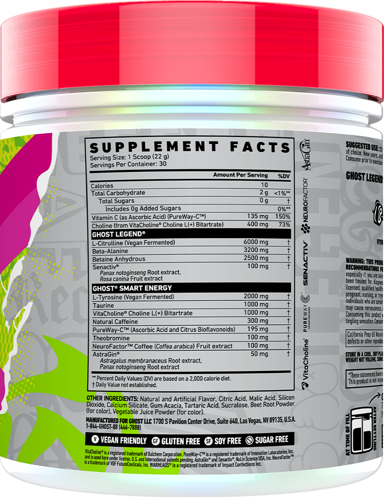 Ghost Legend V4 är utvecklad för att ge dig en ännu kraftfullare träningsupplevelse. Den högre doseringen av L-Citrulline och Beta-Alanin ger intensiva pump och uthållighet, medan naturligt koffein och nootropics ger skarpt fokus. Patenterade ingredienser som PureWay-C® och Senactiv® förstärker effekten och gör denna pre-workout till en topprodukt för seriösa atleter.