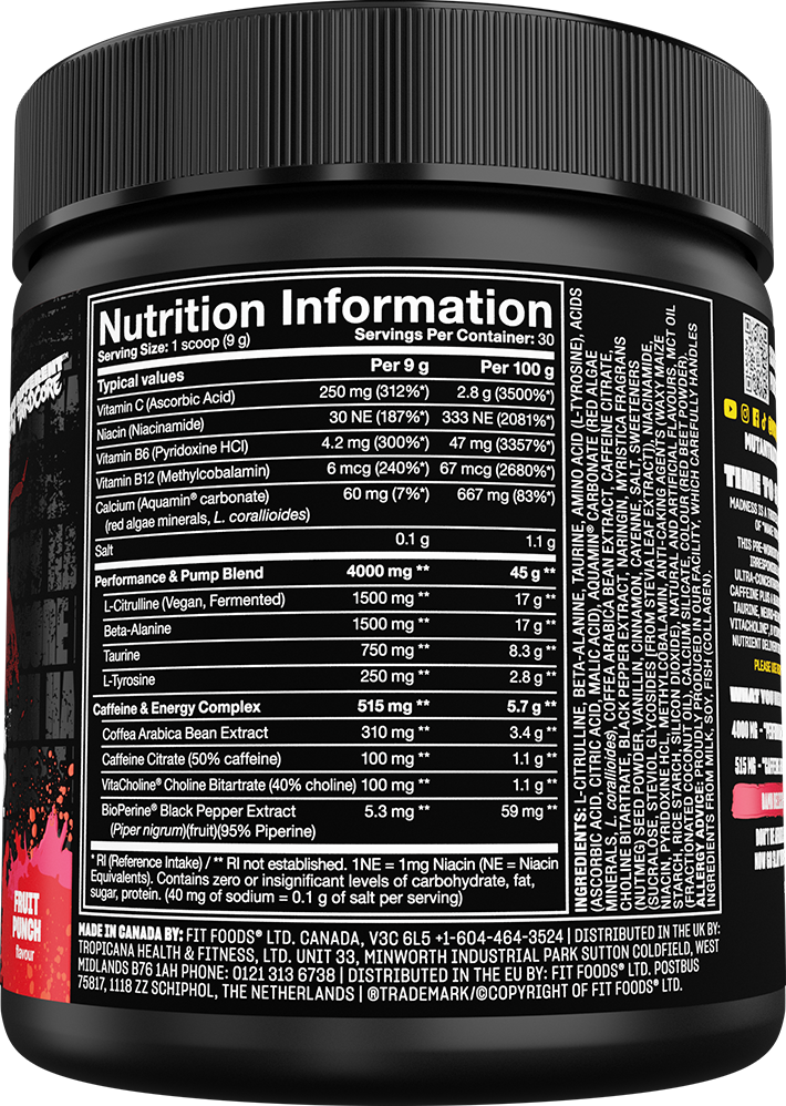 Mutant Madness är ett kraftfullt pre-workout kosttillskott utvecklat för dig som vill ha extra fokus, uthållighet och energi under träningen. Med en effektiv blandning av aminosyror, koffein och BioPerine® är detta en optimal produkt för att ta din prestation till nästa nivå.