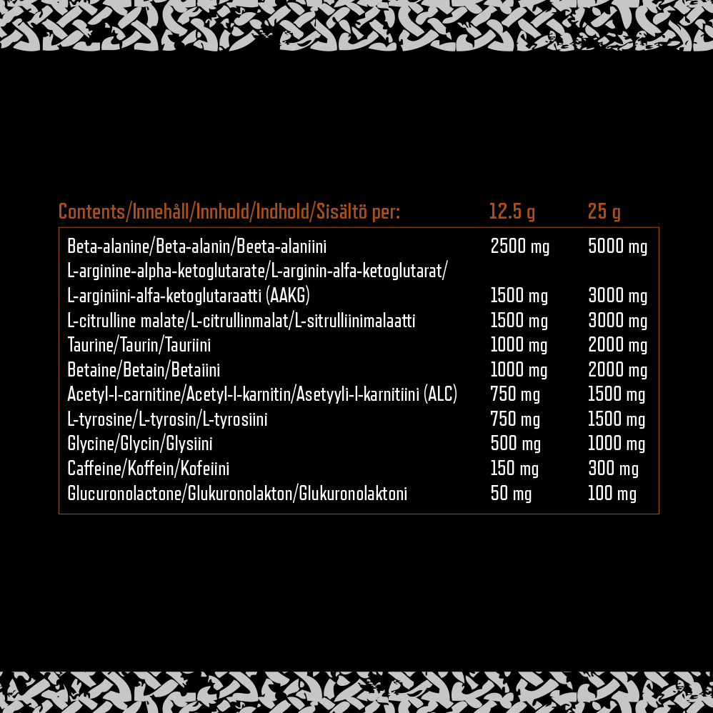 Viking Power Thor’s Hammer Pre-Workout är skapad för dig som vill pressa dig själv till max. Den höga dosen beta-alanin främjar uthållighet, citrullin malat och AAKG ger kraftfulla muskelpumpar, medan koffein och L-tyrosin bidrar till ökad energi och skarpt fokus. Perfekt för intensiva styrke- och konditionspass.