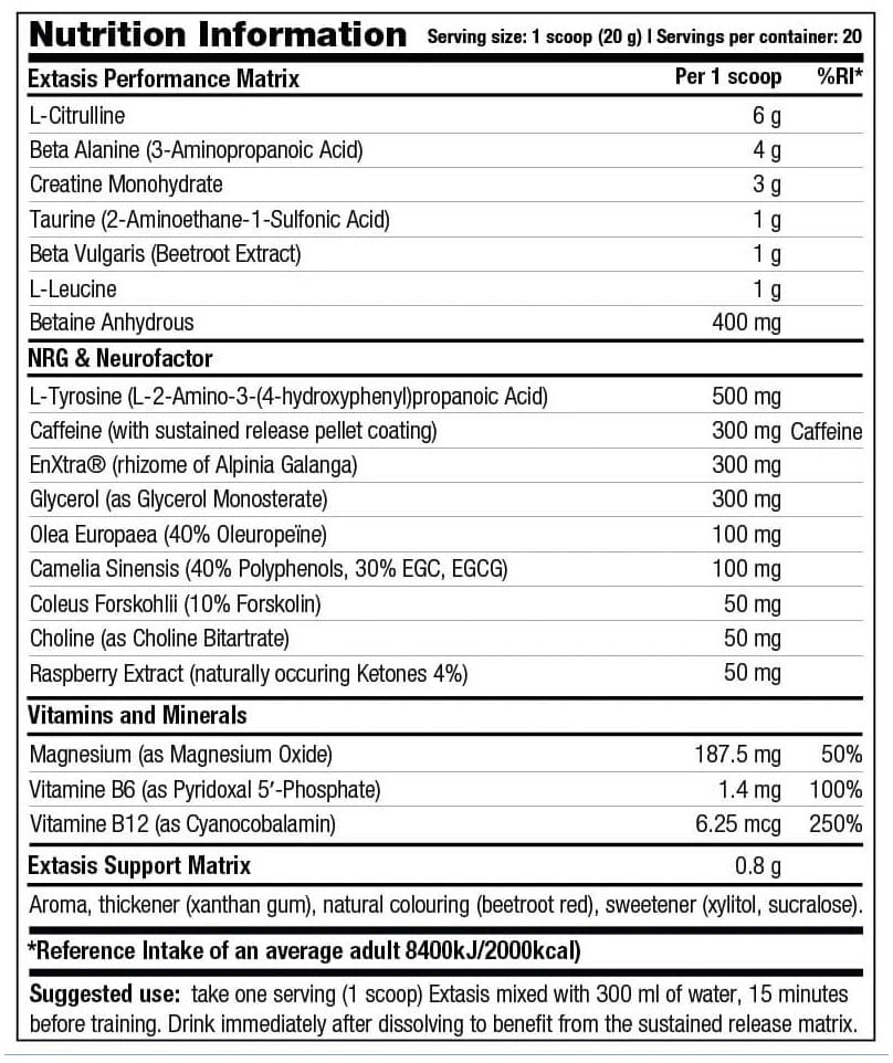 Stacker2 Extasis är den mest kraftfulla pre-workouten i Stacker2-serien – framtagen för elitatleter som vill prestera på absolut högsta nivå. Med 6 g citrullin, 300 mg koffein och en unik energimatrix får du långvarig energi, brutal pump och skarpt fokus under hela träningspasset.