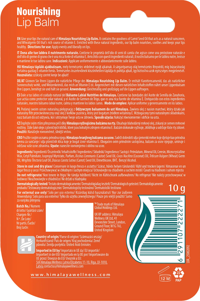 Applicera ett tunt lager Himalaya Nourishing Lip Balm på läpparna vid behov under dagen. För bästa resultat, använd regelbundet som en del av din dagliga hudvårdsrutin.