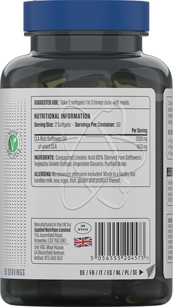 Förbättra din träningsrutin med Applied Nutrition CLA Gold 1000. Denna formula innehåller 2000 mg CLA-rik safflorolja per portion, inklusive 1600 mg CLA (konjugerad linolsyra), en naturlig källa till omega-6-fettsyror. CLA Gold 1000 är perfekt för att stödja fettförbränning och bevara muskelmassa under träning. Endast 2 vegetabiliska softgels per dag behövs för att uppnå effekt.