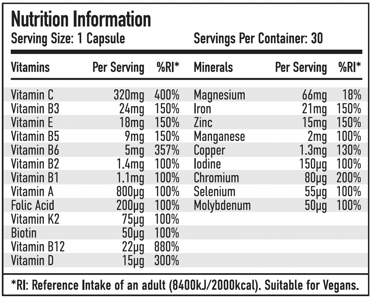 Ta 1 kapsel per dag tillsammans med mat. Varje kapsel motsvarar en full dagsdos av vitaminer och mineraler för dagligt stöd.