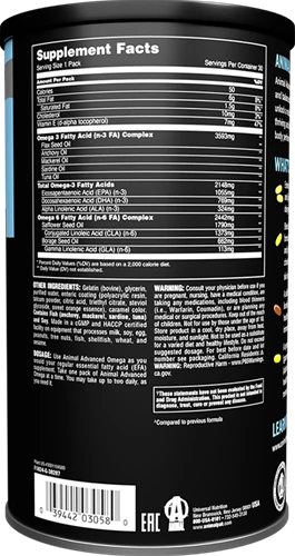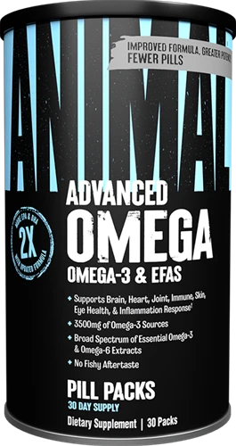 Animal Omega från Universal Nutrition är ett kompromisslöst kosttillskott med essentiella fettsyror, särskilt framtaget för seriösa atleter. Varje daglig dos innehåller en balanserad blandning av omega-3 och omega-6 från hela 10 högkvalitativa källor. Med 4000 mg omega-3, inklusive 450 mg EPA och 350 mg DHA, samt 2500 mg omega-6 från bland annat linfrö-, lax- och sillolja, får du ett komplett tillskott för att stödja kroppen varje dag.