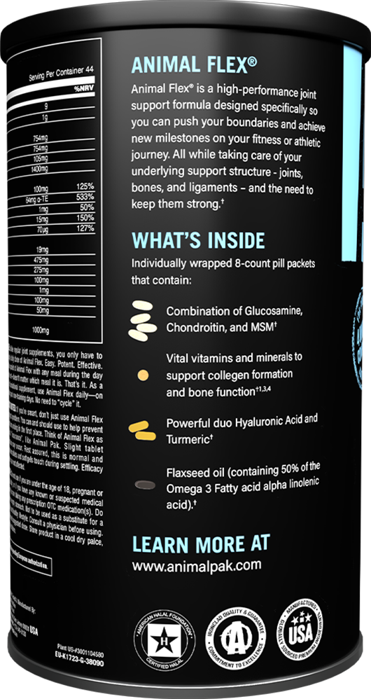 Animal Flex är ett komplett dagligt ledstöd för seriösa lyftare som vill skydda leder, brosk och ben över tid. Formulan kombinerar glukosamin, MSM, kondroitin, kollagen och hyaluronsyra med växtextrakt från gurkmeja, boswellia och ingefära – plus utvalda vitaminer och mineraler för en helhetslösning i praktiska dagsportioner.