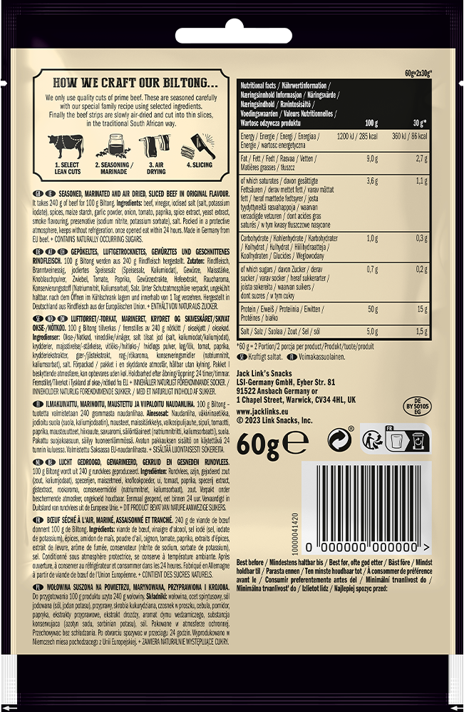 Jack Link’s Biltong är naturligt proteinrikt och görs av magert nötkött av högsta kvalitet. Det krävs hela 229 g färskt nötkött för att skapa 100 g biltong, vilket resulterar i en intensiv köttsmak och hög proteinhalt. Ett smakfullt, näringsrikt och praktiskt snacks för aktiva människor.