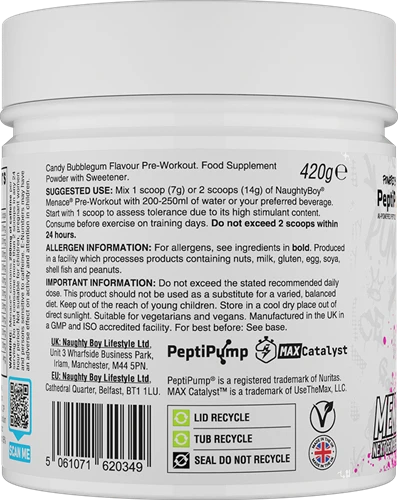 Menace V2 kombinerar citrullinmalat och beta-alanin för pump och uthållighet med taurin, tyrosin och citikolin för skarpt fokus. Tillskottet av Juglans Regia, teobromin och koffein ger dig energi och alerthet, medan PeptiPump® förstärker pumpen ytterligare. En komplett pre-workout för dig som vill prestera på topp.