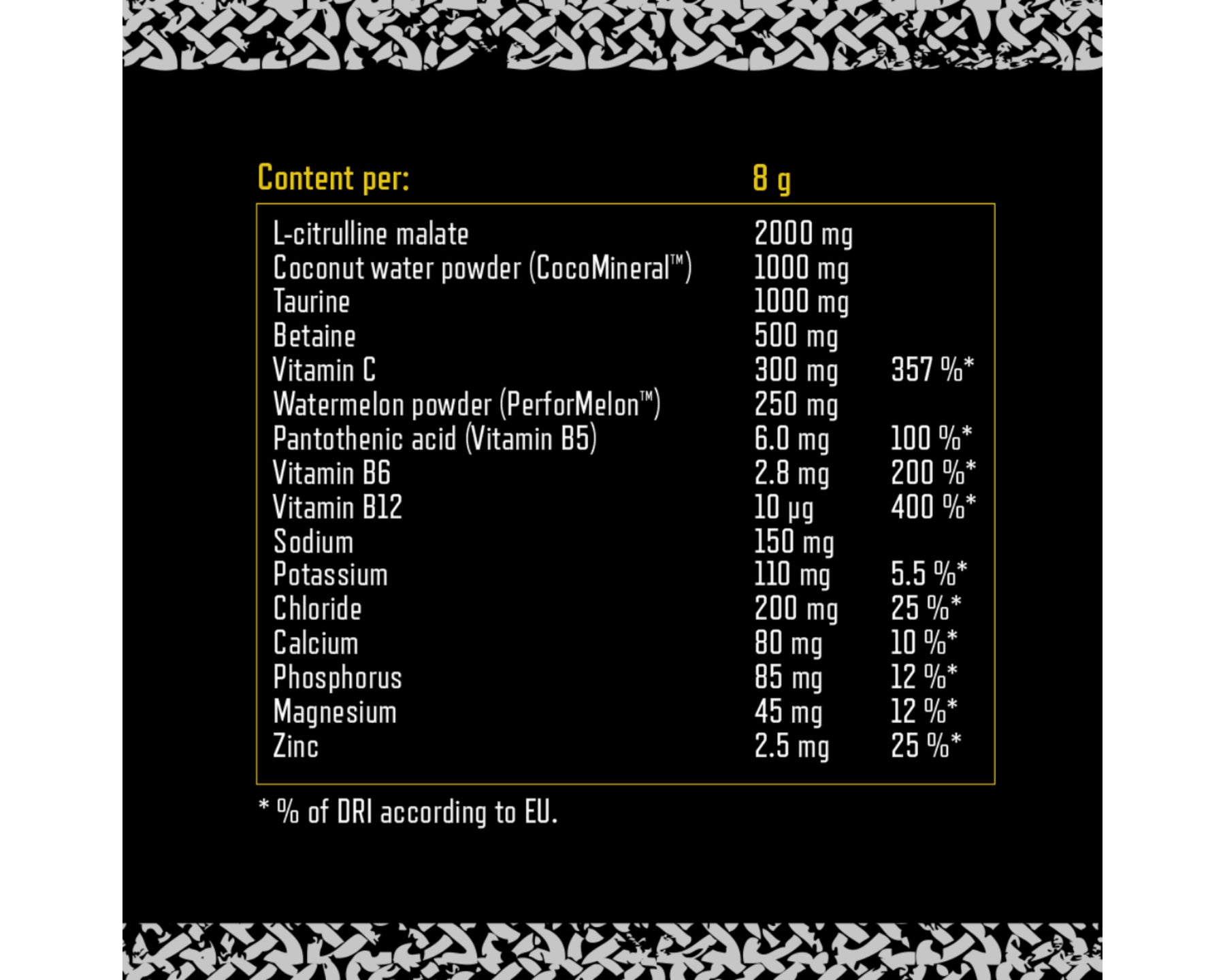 - L-citrullinmalat: 2 000 mg per portion